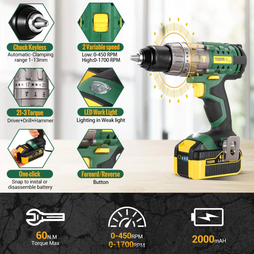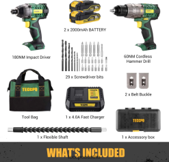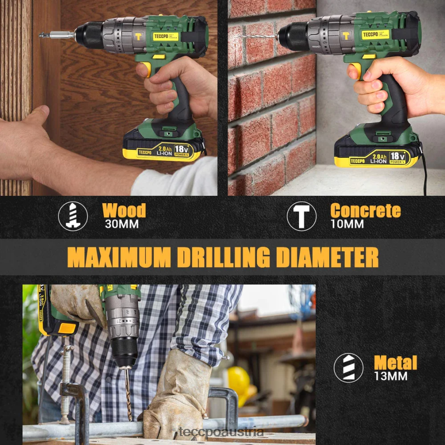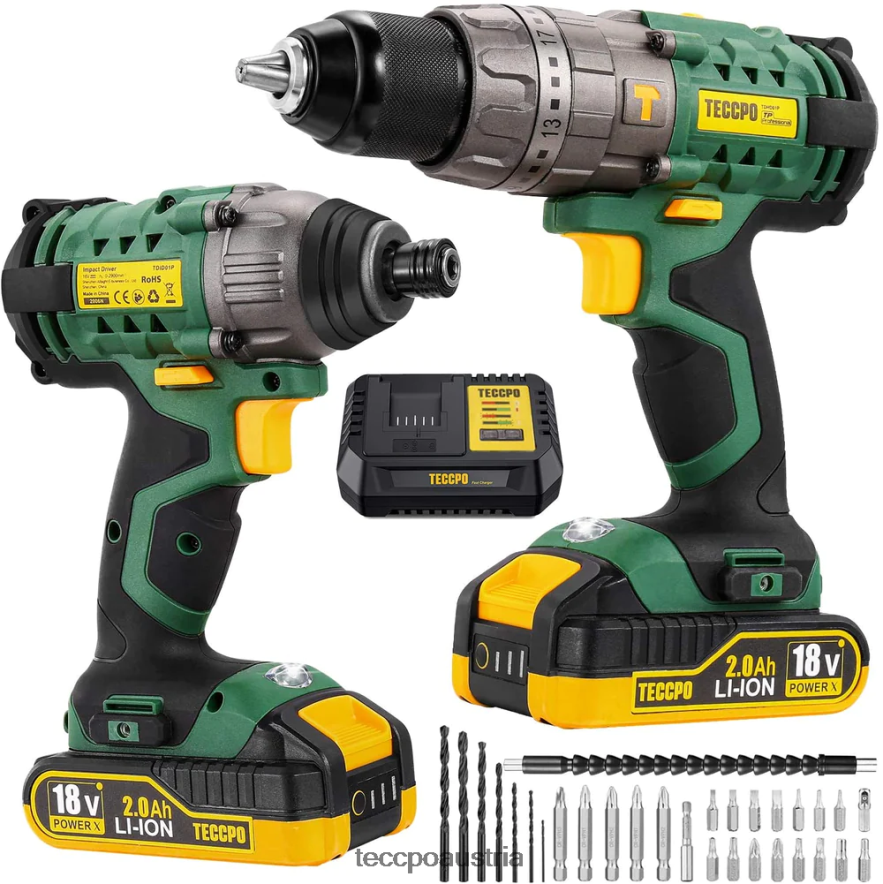 - Set mit 2 x 18-V-Bohrern. Teccpo Akku-Bohr- und Schlagschrauber-Set. Enthält: 2 Akkus, 1 Ladegerät, 1 Koffer und viele nützliche Zubehörteile für leistungsstärkere Funktionen.