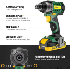 - 18 V – 180 Nm Schlagschrauber, 0 – 2900 U/min Drehzahl und hohe Arbeitseffizienz zum Schrauben und Lösen von Schrauben. 1/4 Zoll (6,35 mm) Schnellwechselfutter ist bequemer für den Austausch von Zubehör.