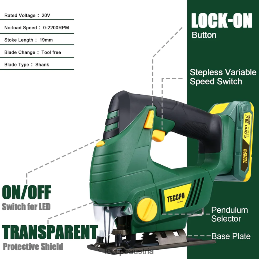 - (Akku austauschbar)Der Akku dieser Akku-Stichsäge ist mit allen Teccpo- und Popoman-Akkus kompatibel.