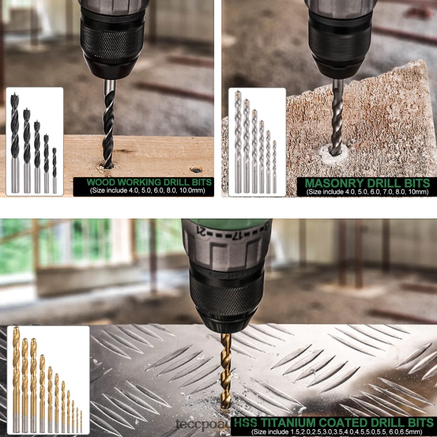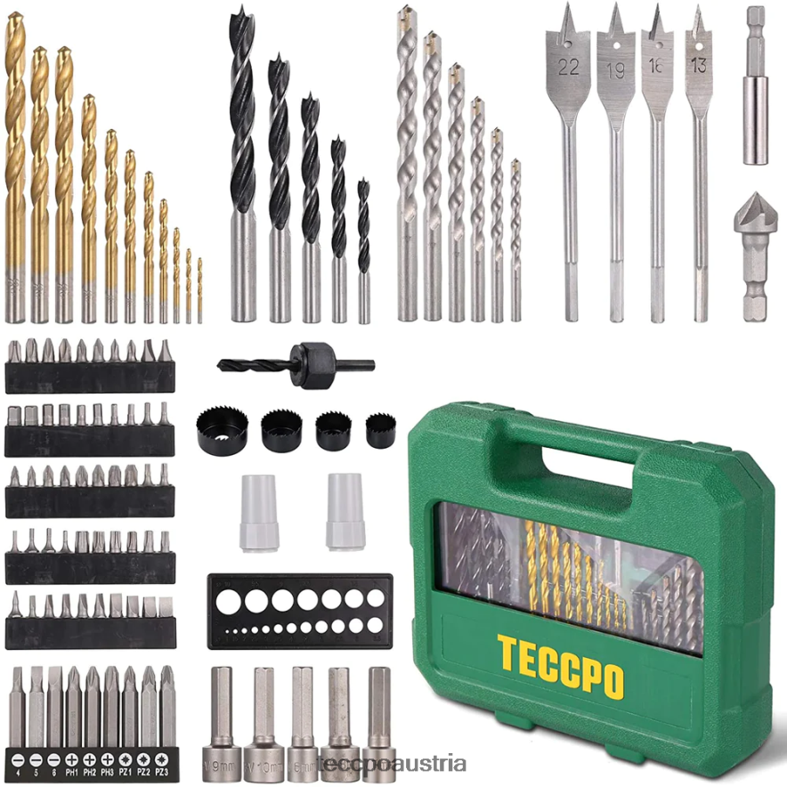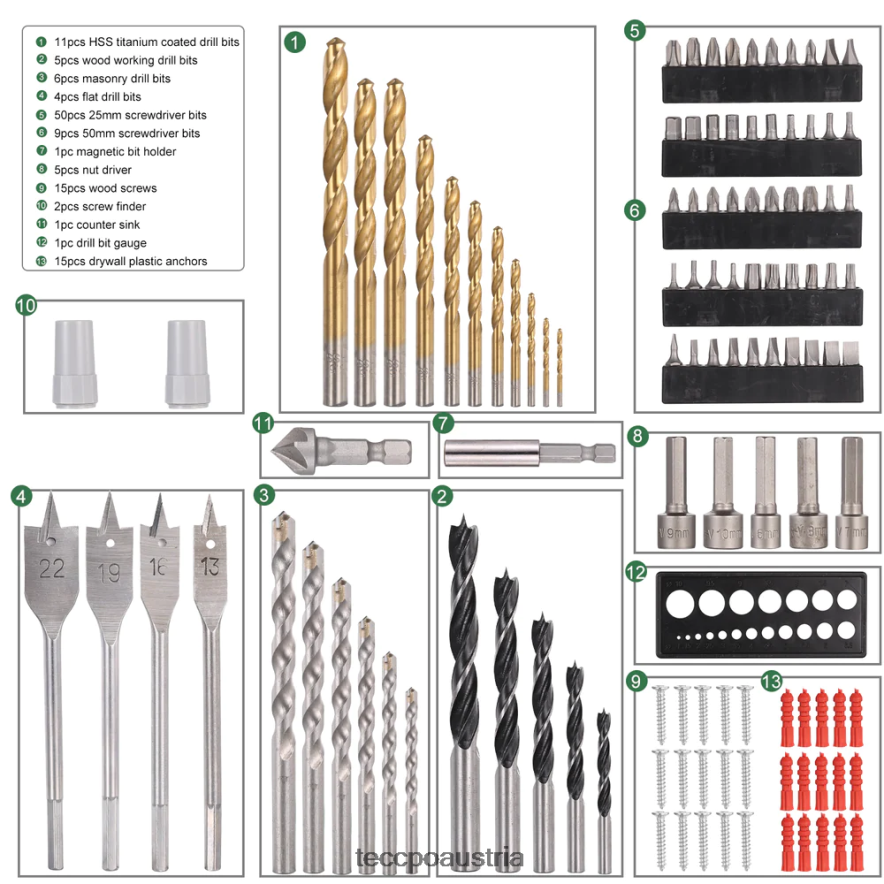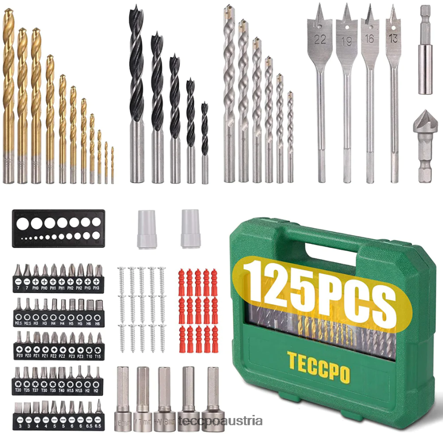 (125-teiliges Bohrer- und Schraubenset)11 x Bohrer für Metall 1,5–6,5 mm; 6 x Bohrer für Zement 4–10 mm; 5 x Bohrer für Holz 4–10 mm; 4 x Bohrer für Kelle 13–22 mm; 50 x 25 mm Schraubendreherbits; 9 x 50-mm-Schraubendreherbits; 5 x 6–10 mm Steckschlüssel; 1 x Bit-Adapter; 1 x Fräsen; 2 x Lochmessschraubendreher; 2 x Stellungsregler; 15 x Wandausdehnungsrohr; 15 x kleine Hardware-Schraube.
