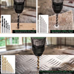 - (100 Stück Bohrer und Schraubensatz) Dieses Bohrerset enthält 11 Stück HSS-Titanbeschichtete Bohrer, 5 Stück Holzbearbeitungsbohrer, 4 Stück Flachbohrer, 50 Stück 25-mm-Schraubendreher-Bits, 9 Stück 50-mm-Schraubendreher-Bits, 1 Stück magnetischer Bithalter, 5 Stück Steckschlüssel, 15 Stück Holzschrauben, 2 Stück Schraubensucher, 1 Stück Senker, 1 Stück Bohrerlehre, 15 Stück Trockenbau-Kunststoffdübel, die Ihren unterschiedlichen Anforderungen gerecht werden können.