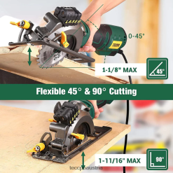 - Fasenschnitt von 0 bis 45 Grad und variable Klingentiefe. Mit der kompakten Kreissäge von teccpo können Sie den Schnittwinkel stufenlos von 0 Grad bis 45 Grad einstellen. Die Schnitttiefen können auch problemlos auf eine maximale Schnitttiefe von bis zu 1-11/16 Zoll bei 90 Grad und 1-1/8 Zoll bei 45 Grad eingestellt werden. Die Winkel- und Tiefeneinstellung erleichtert Ihnen verschiedene Schnitte in der Holzbearbeitung. Das linksseitige Klingendesign gibt Ihnen eine klare Sicht auf die Schnittlinie.