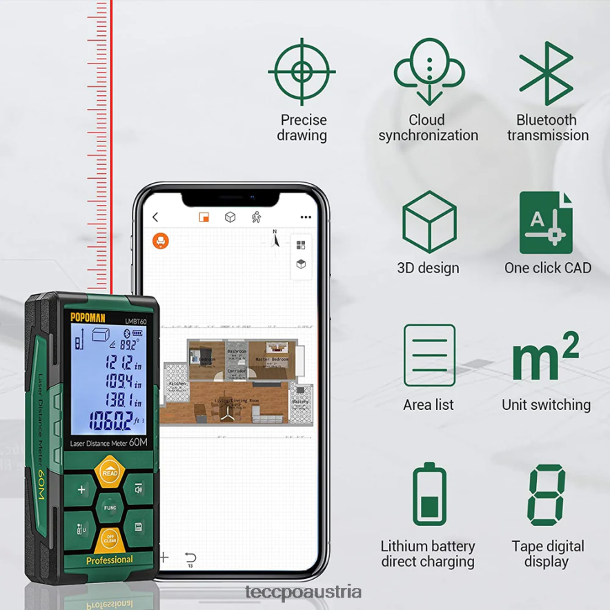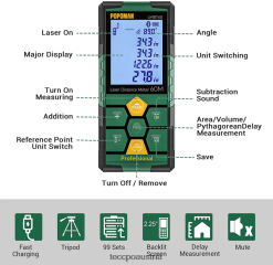 - [App für Smart-Geräte + elektronischer Winkelsensor] – Popomans neuer Bluetooth-Laser Measure bietet eine App für Smart Devices. Es kann für Ihre Anwendung eine Hart-/Weichdekoration im Innenbereich simulieren. Es kann auch die Größe der Möbel an Ihre Bedürfnisse anpassen und bietet Ihnen eine Vielzahl von Möbelstilen zur Auswahl. Der elektronische Winkelsensor ist genauer als die herkömmliche Wasserwaage und der Winkel wird in Echtzeit angezeigt. sorgen für mehr Komfortfür Heimdekoration.