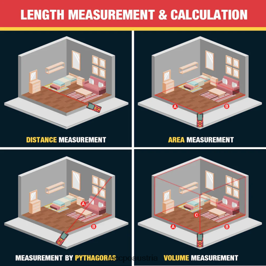 - (einfach zu bedienen) Mit einer Taste können Sie vier Einheiten umschalten: m / in / ft / ft + in, das Entfernung, Fläche, Volumen, Pythagoras (indirekte Messung), kontinuierliche Messung, Addition und Subtraktion sowie Maximal- und Minimalwerte anzeigen kann, um unterschiedliche Messanforderungen zu erfüllen