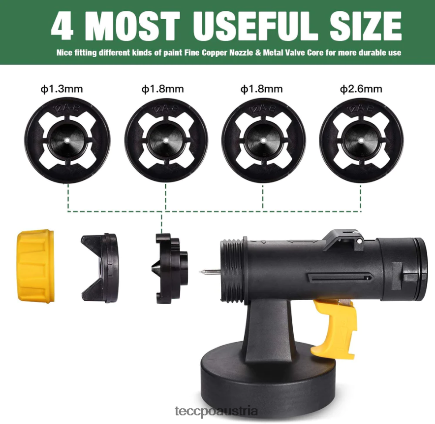 - [ 4 nützliche Düsen und 3 Sprühmuster ] – 4 nützliche Düsen sorgen für eine bessere LeistungHaptik im Vergleich zum Pinsel. Dieses Sprühgerät kann auf 3 verschiedene Sprühmuster eingestellt werden: horizontal, vertikal und kreisförmig, ausgestattet mit 4 Düsen unterschiedlicher Größe (1,3 mm/1,8 mm/1,8 mm/2,6 mm) für jedes Malprojekt. 1,3-mm- und 1,8-mm-Düsen eignen sich hervorragend für dünne Farben wie Versiegelungen und Lacke. Eine 2,6-mm-Düse eignet sich hervorragend zum Sprühen von Latexfarbe und Milchfarbe.