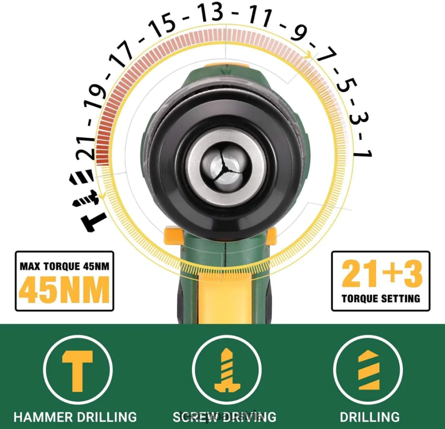 (45 nm mit Rotation Hammerfunktion) 3-in-1-Arbeitsmodus: Bohrer, Bohrer und Schraubendreher, können zum Bohren von Löchern in Zement-, Holz-, Metall-, Kunststoffwänden usw. verwendet werden gebraucht. 21 Drehmomentstufen sorgen für präzise Schraubarbeiten in allen Einstellungen. 2 Geschwindigkeiten (0–400/1500 U/min): niedrige Geschwindigkeit zum exakten Anziehen der Schrauben und hohe Geschwindigkeit zum schnellen Bohren.