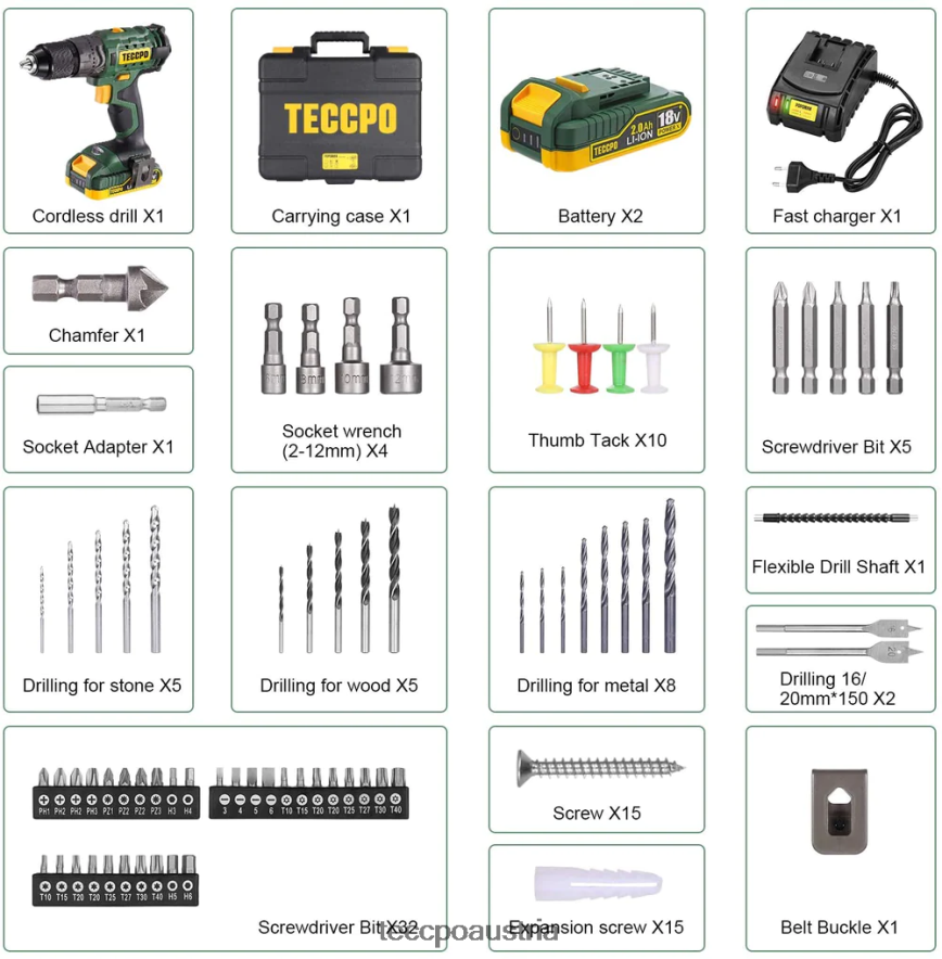 ( 24 Monate Qualitätsversprechen & ideales Geschenk)1 x Akku-Bohrschrauber, 2 x 2,0 Ah Akkus, 1 x Schnellladegerät, 1 x flexibler Schaft, 1 x Adapter für Steckschlüssel, 5 x Loch für Holz, 5 x Bohrer, 8 x Metallbohrer, 4 x Schlüsselhalter, 2 x flacher Holzbohrer, 1 x Schaftfräser, 1 x flexibler Schaft, 6 x Schraubendreher, 15 x Erweiterung Schrauben, 15 x Schrauben, 10 x Reißnägel, 1 x Gürtelschlaufe, 30 x Schraubenstück und 1 x Werkzeugkoffer.
