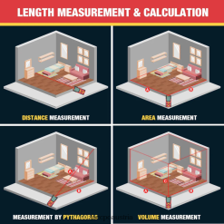 - (einfach zu bedienen) Mit einer Taste können Sie vier Einheiten umschalten: m / in / ft / ft + in, das Entfernung, Fläche, Volumen, Pythagoras (indirekte Messung), kontinuierliche Messung, Addition und Subtraktion sowie Maximal- und Minimalwerte anzeigen kann, um unterschiedliche Messanforderungen zu erfüllen